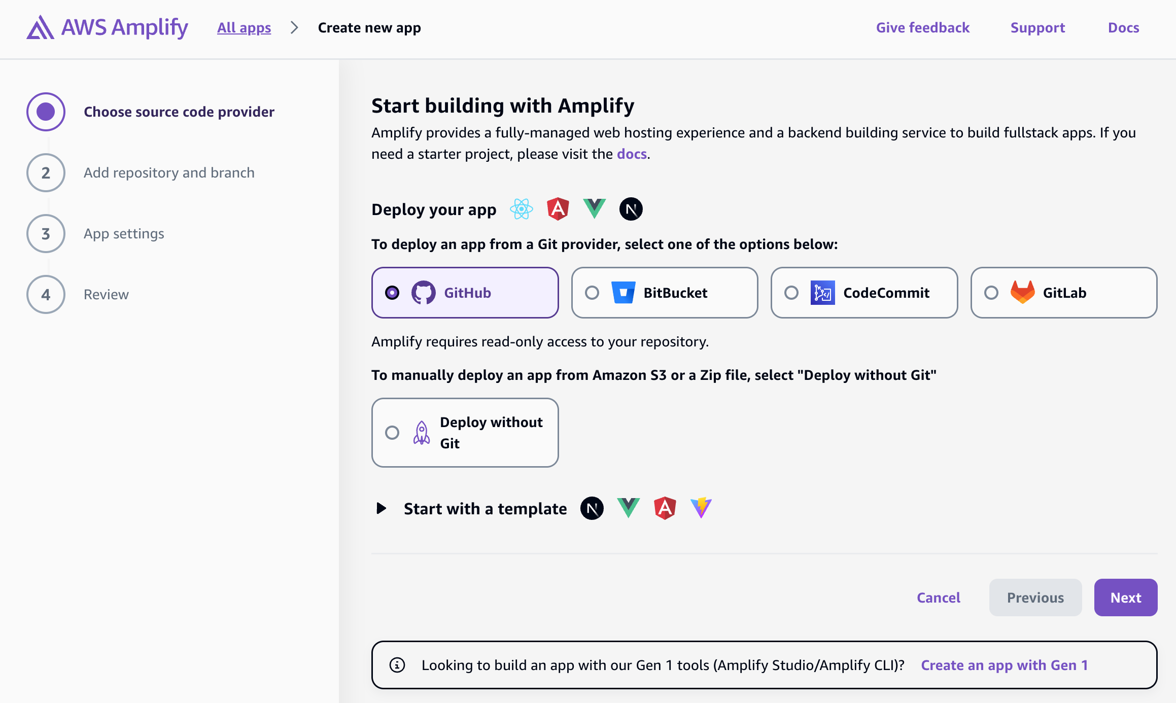 - Choose GitHub (or your provider of choice) and click on Next.