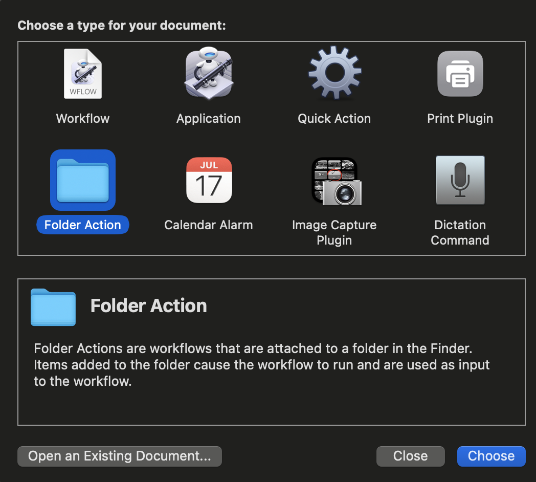 - Find the dropdown at the top labeled Folder Action receives files and folders added to. Use the dropdown to select the