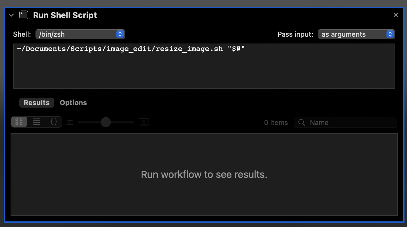 - After the shell script has been created, you can now tell Automator where the script is located and add a placeholder for the arguments. Automator will use the full file name (using a full path) for the argument. Example:
