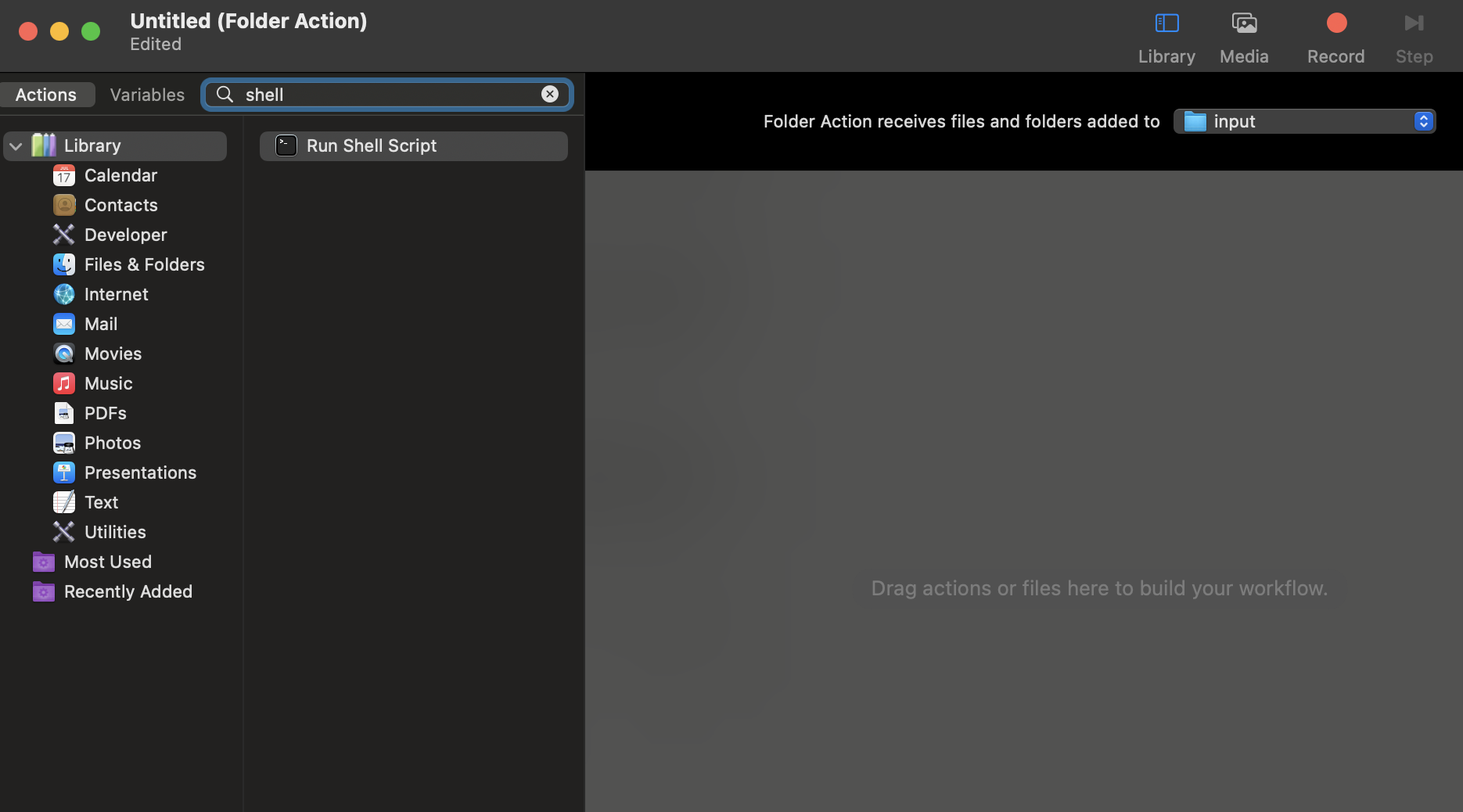 In the search field, type shell to easily find the Run Shell Script action. Drag it over to the Main section of the window.